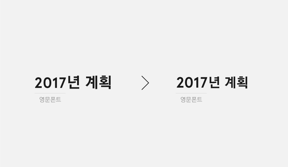 영문폰트와 한글폰트, 이 두가지는 엄연히 다른 스타일의 폰트입니다. 다른 스타일과 가이드를 가지고 만들어진 두가지의 폰트를 같은 크기로 하여 같이 붙여두었다고 해서 실제로 보이기에도 같은 크기가 되는 것은 아닙니다. 특히나 영문폰트와 한글폰트와 같은 경우에는 사용하는 언어가 다르기 때문에 영문폰트보다 한글폰트가 1-2px정도 큰 경우가 많습니다. 조금의 오차도 없이 정확하게 디자인을 하고 싶다면 디자인을 할 때에도 영문폰트를 한글폰트보다 1-2px정도 크게 하거나 한글폰트를 영문폰트보다 1-2px정도 작게 잡고 디자인하면 됩니다. 개발자에게 파일을 전달 할 때에도 디자인할 때 설정했던 규칙을 알려주어 개발상에서도 디자인과 같은 크기로 영문폰트와 한글폰트가 보일 수 있도록 해주면 좋을 것 같습니다.