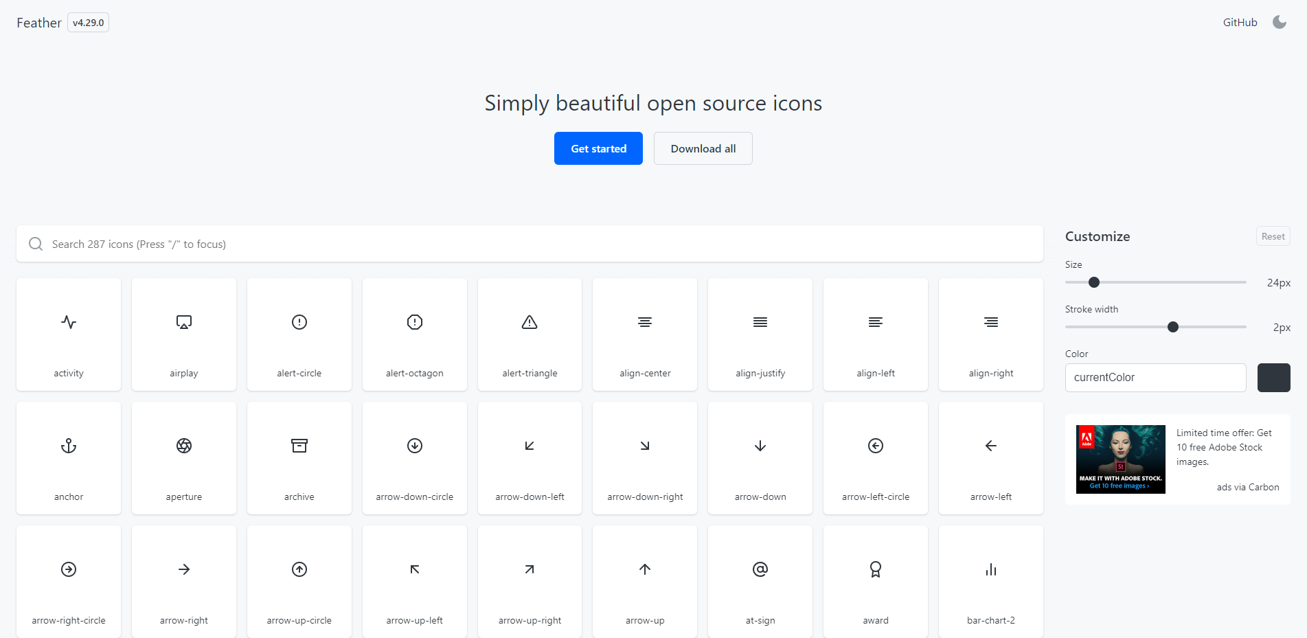 깃허브의 엔지니어인 cole bemis라는 디자인시스템개발자의 의해 만들어진 아이콘 시스템입니다. 아이콘들이 깔끔하고 가벼운 느낌의 라운딩으로 제작되어 있어 자주 이용하게 되는 것 같습니다. 종류가 다양한 편은 아니지만 아이콘을 제작할 때 디자인을 참고하기에도 좋습니다. 위의 Ant design과 마찬가지로 MIT 라이센스를 사용하고 있습니다.